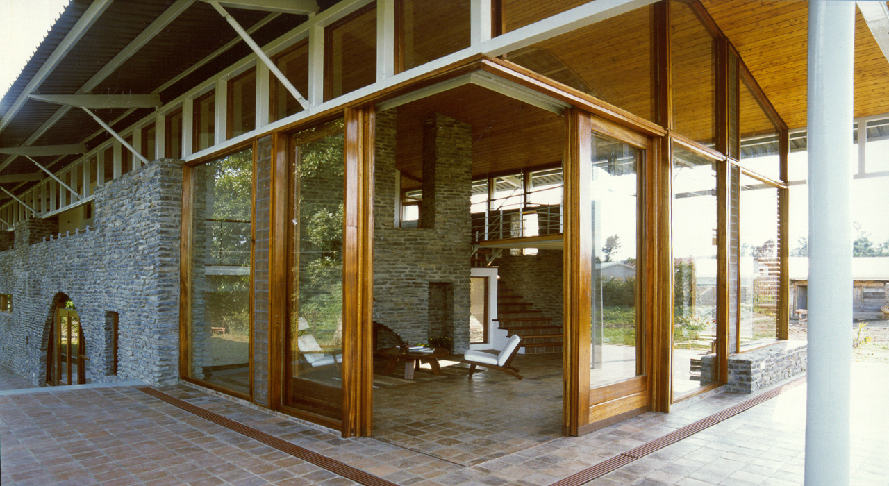 The curved roof is made out of corrugated sheets. The walls, erected out of natural stone from a quarry nearby, amount to 60 centimetres in diameter in order to be able to resist an earthquake. The house is kept together by a dominant steel structure, which makes the roof on top seem to float. The window openings which are carved deep within the natural stonewalls have been situated where the climatic conditions within the house demand for it.